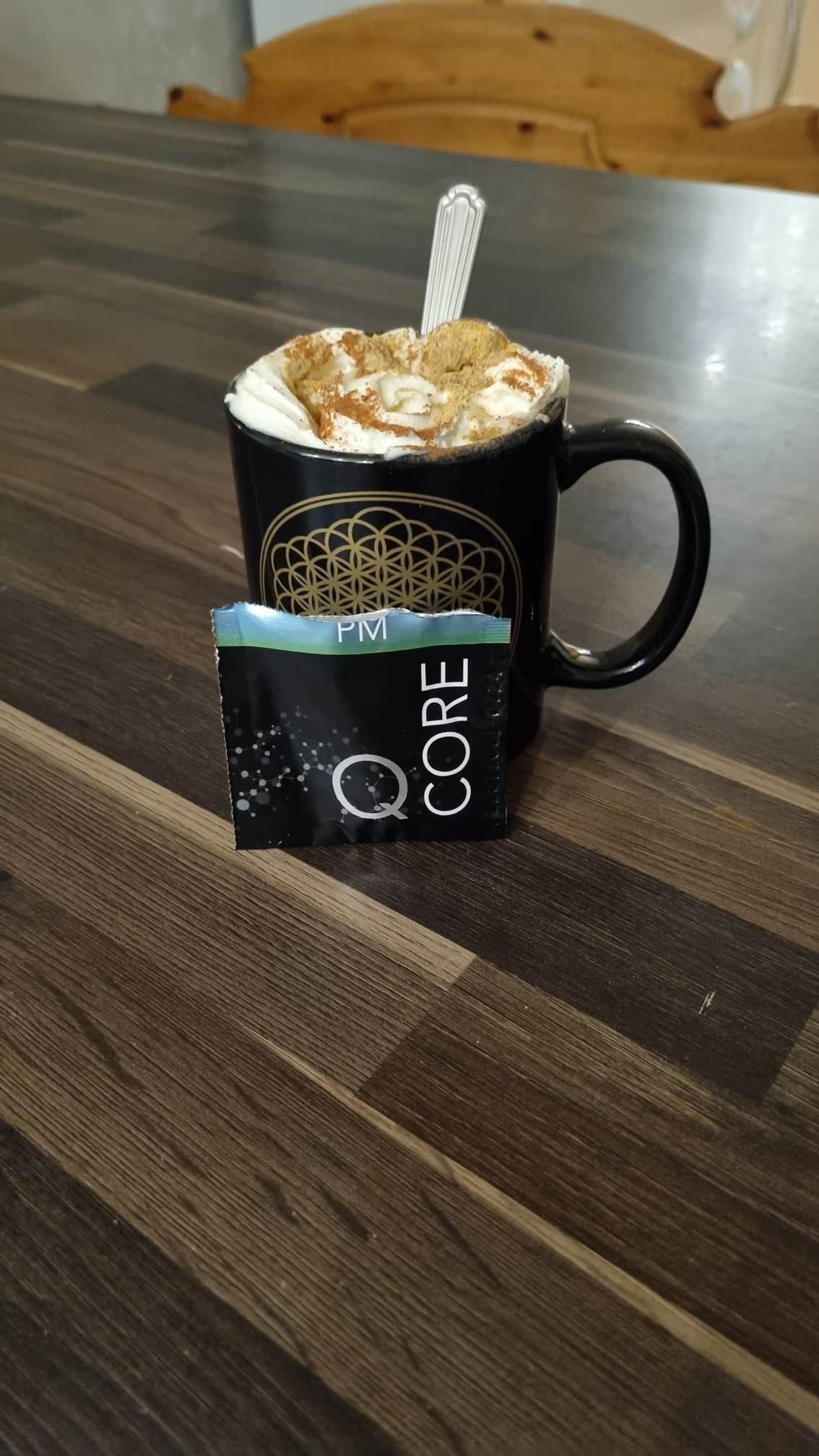 Bilde nr 1: Laget meg Q Twist Hot Cocoa. Søt men veldig god. En kakao, som gjør deg avslappet. Oppå toppen har jeg tatt Q core pm.