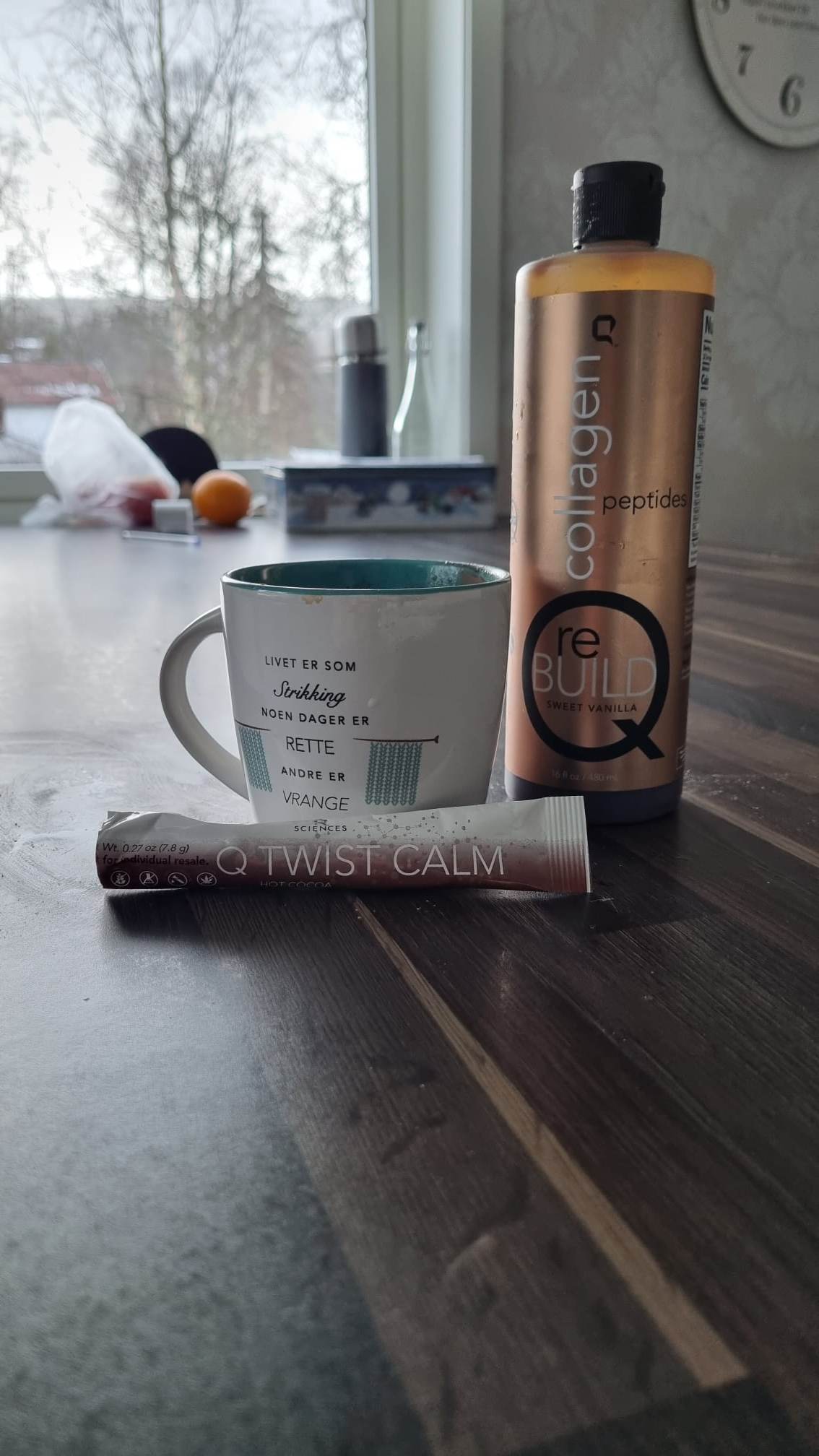 Bilde nr 5: Her ser dere hvordan Q Twist Hot Cocoa posen ser ut. Trenger ikke ta hele posen. I flasken er det Q Rebuild Collagen. Perfekt etter trening. Denne hjelper kroppen på styrke og form.