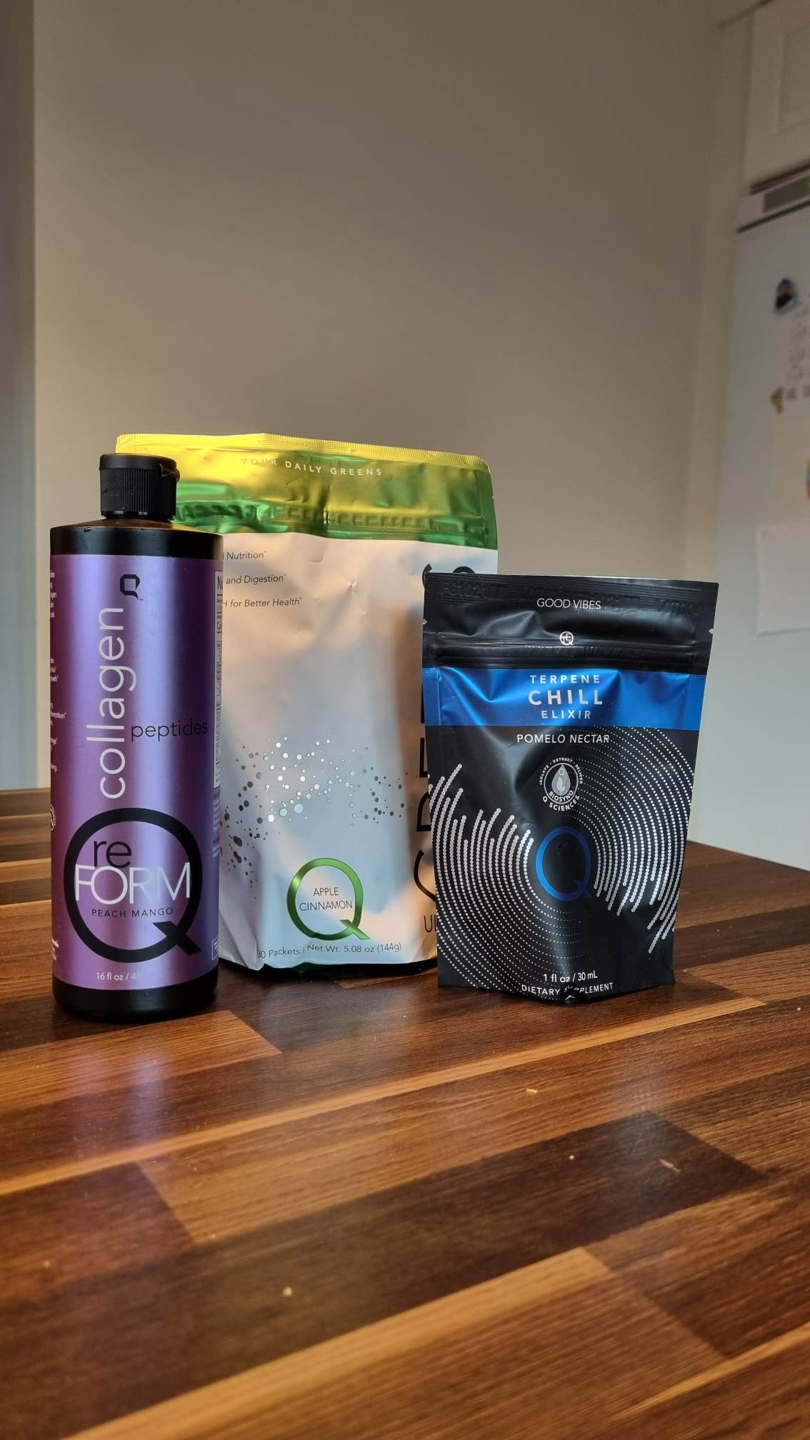 Bilde nr 3: Her ser dere tre ting. Første og andre hjelper kroppen din til å bli bedre fysisk. Disse to er da Q Reform Collagen og Q Greens. Siste er Terpene Chill. En som hjelper på tankekjøret og, å slappe av.